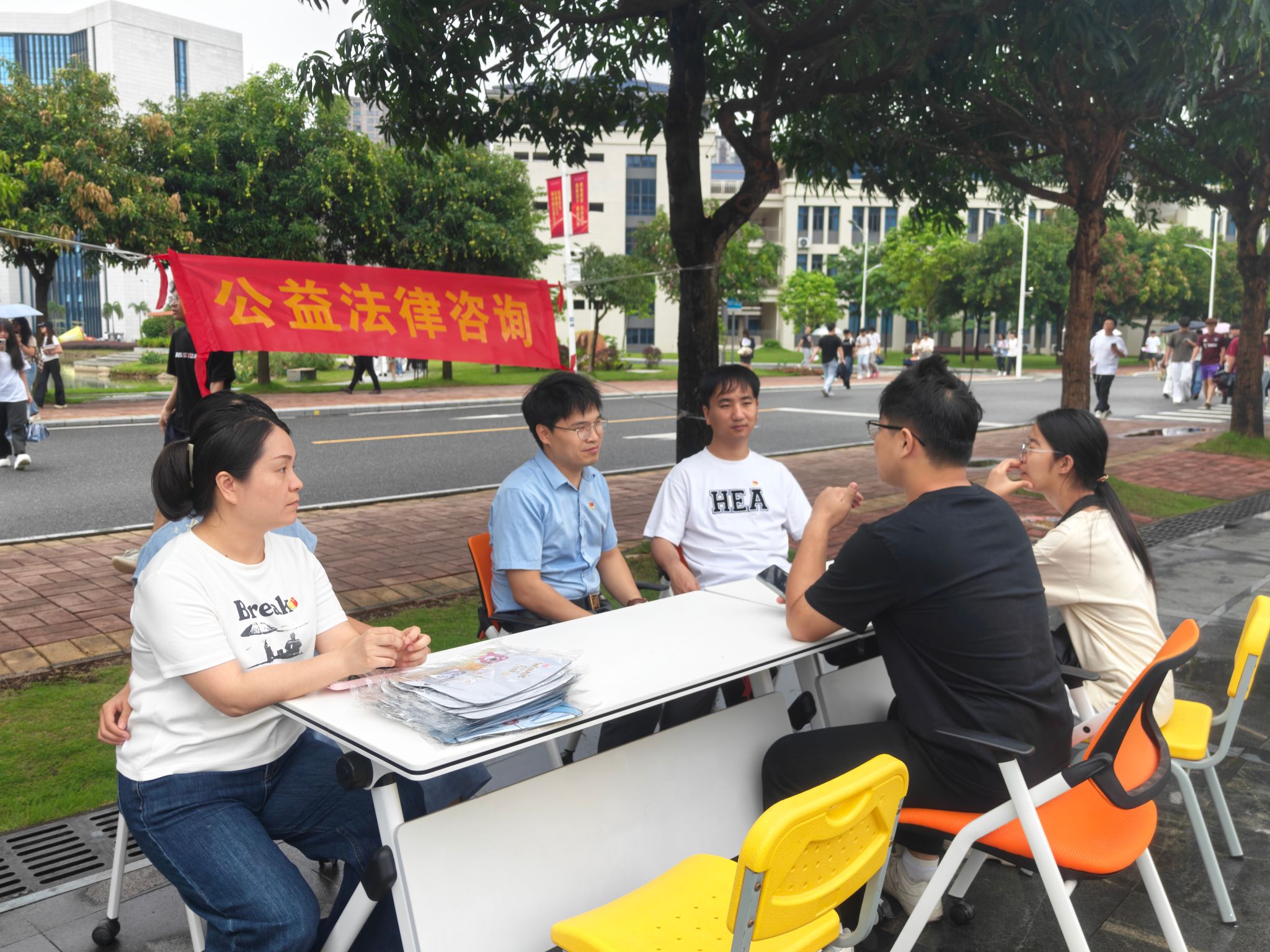 为深入推进思政课实践教学创新,推动法治教育与为民服务深度融合,切实回应师生身边的法律难题,4月28日中午12时起,思政课实践教学党支部联合法律诊所,在ok138太阳集团古天乐鼎湖校区美食广场顺利开展了线下公益法律咨询活动。李雷、洪儒、王莉娟、张宁娜、黄新新等老师共同参与。
