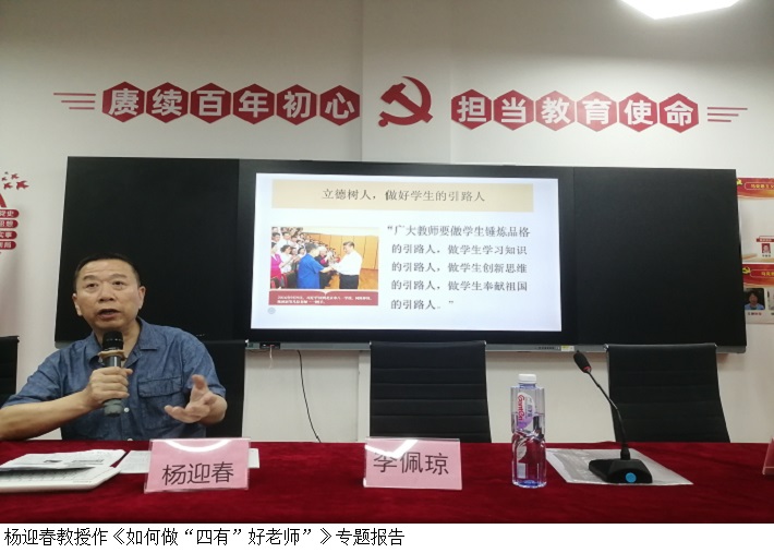 随后,杨迎春教授作《如何做“四有”好老师”》专题报告,从“师德为先”,做好学生的引路人、“教学为要”,不断提高教学质量、“科研为基”,实现科教融合、“发展为本”,不断追求卓越四个方面阐述一个好老师,既是“经师”,又是“人师”,既能授业、解惑,传递科学知识、方法和技能,又能明德、传道,引导学生学会做人。只有把这两个方面统一起来,才能成为一名好老师。