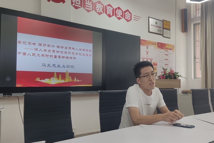 会上,由青年教师庞明明介绍了习近平总书记在考察中国人民大学时发表的重要讲话内容并统一观看了中国人民大学王易教授作的主题为“牢记嘱托 踔厉前行 讲好立德树人关键课程——学习习近平总书记在考察中国人民大学时重要讲话精神”的报告。针对习近平总书记在考察中国人民大学时发表的重要讲话内容,青年教师们反映强烈。