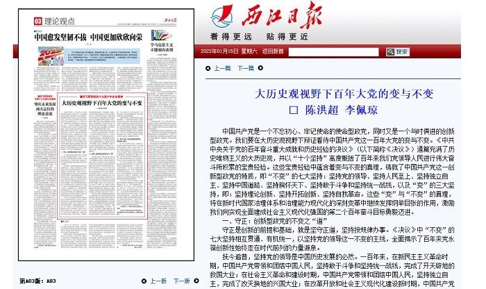 近日,《西江日报》以大篇幅刊发我院陈洪超老师与李佩琼副教授联合撰写的《大历史观视野下百年大党的变与不变》评论性文章。文章指出,十九届六中全会《决议》总结的十大宝贵历史经验蕴含着变与不变的真理,这就是中国共产党具有的“创新型政党”特质,即“不变”的七大坚持:坚持党的领导、坚持人民至上、坚持独立自主、坚持中国道路、坚持胸怀天下、坚持敢于斗争和坚持统一战线,以及“变”的三大坚持,即:坚持理论创新、坚持开拓创新、坚持自我革命。在变与不变的辩证统一中,党才以人民利益代表者的喜悦迎来百年华诞,以改革开放创新者的姿态书写百年辉煌。