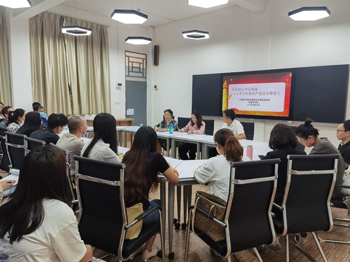 本次会议共分为两个部分。首先,曾中新副院长主持以“不忘初心 牢记使命--学习中国共产党百年辉煌史”为主题的党史学习大会。本次学习从“为什么学习党史”、“中共党史的基本脉络”、“把握四史的逻辑关系”、“中共党史的根本经验与规律”四个方面展开学习。曾副院长表示党史学习意义重大,只有经过深刻的学习才能讲好思政课,做好我们的本职工作。学院王琳院长强调“三个必然要求”、“六个进一步”等学习重点,要求我们思政课教师努力学习党在发展历程中的革命经验、探索经验、奋斗经验,以最深厚的党史理论功底为学生答疑解惑。杨迎春教授深情回顾了他与党的故事。他说,环顾全世界的党派,中国共产党是最不容易的党,也是最以人民为中心的党。学院黄璐老师、曹海东老师、韩佩老师分别发言,结合教学实际谈了对党史学习意义的理解,他们纷纷为党的百年华诞送上美好祝福。