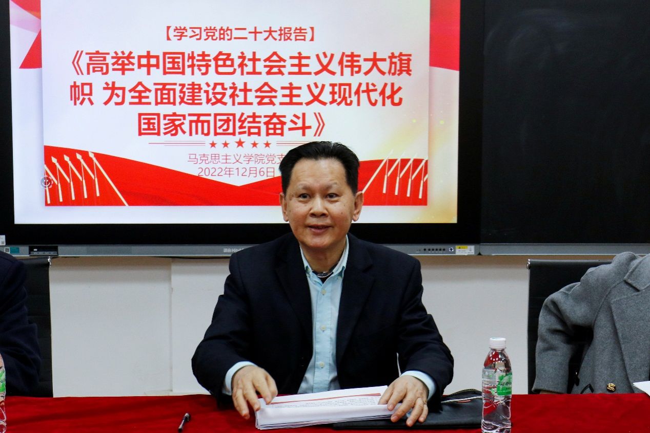张东生重点围绕学习宣传贯彻党的二十大精神的重大意义、精神实质以及党的二十大对教育的新部署、新要求等方面,结合全国上下的巨大变化、马院建设的欣欣向荣,对党的二十大精神进行了宣讲。