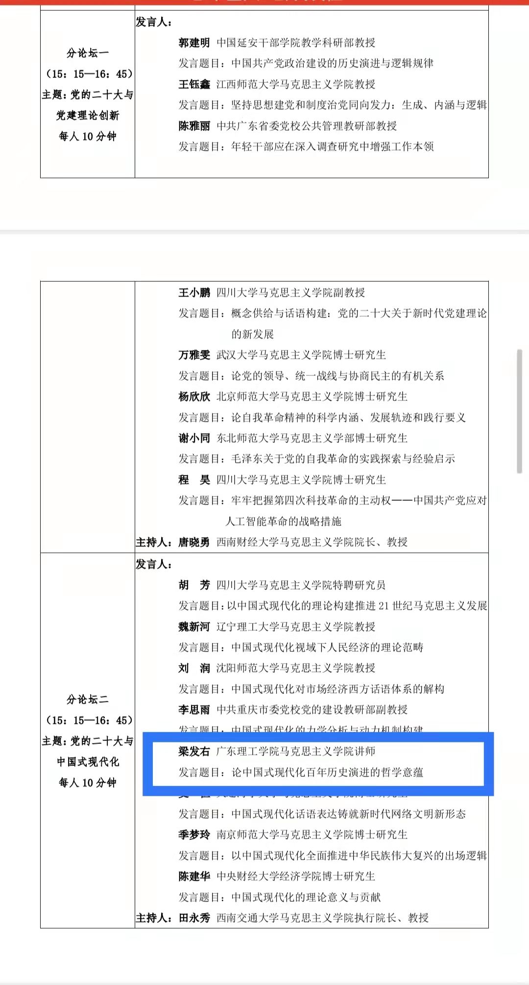 本网讯(太阳集团tyc138)12月17日,“中国共产党与中国之治”第二届高端论坛暨“党的二十大与21世纪马克思主义理论创新”学术研讨会在四川大学隆重召开,我校太阳集团tyc138梁发右老师受邀参会并以线上形式作了“论中国式现代化百年历史演进的哲学意蕴”的主题发言,获得了与会专家的肯定与赞扬。本次受邀充分彰显了我校太阳集团tyc138教师良好的科研素养和精神风貌,是我校教师学习贯彻党的二十大精神的具体体现,对于提升我校的学术影响力具有积极意义。