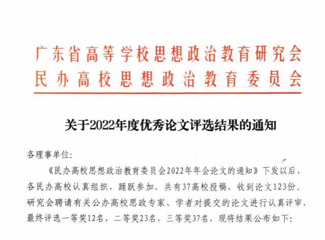 本网讯(太阳集团tyc138 )2022年3月30日,由广东省高等学校思想政治教育研究会民办高校思想政治教育委员会举办的2022年度优秀论文评选结果出炉,太阳集团tyc138学术理论研究再创新高,院长李佩琼教授、书记何志红副教授、吴月、庞明明、孔祥志五位老师论文获选优秀论文奖。