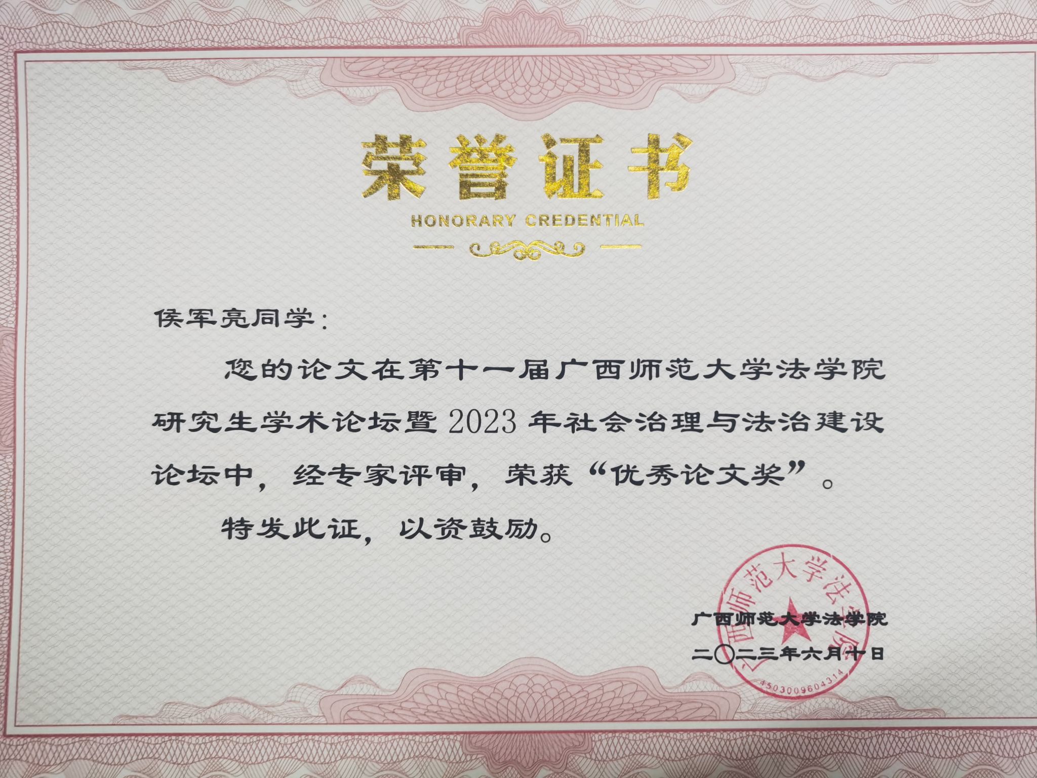 2023年6月10日,由广西师范大学法学院主办的“第十一届广西师范大学法学院研究生学术论坛暨2023年社会治理与法治建设论坛”在广西师范大学法学院模拟法庭召开,我院侯军亮老师受邀并在大会发言,其撰写的论文经专家评审,获得“优秀论文奖”。