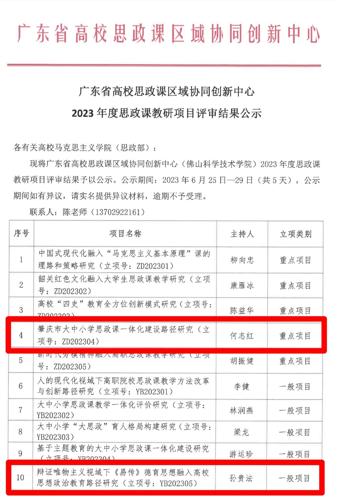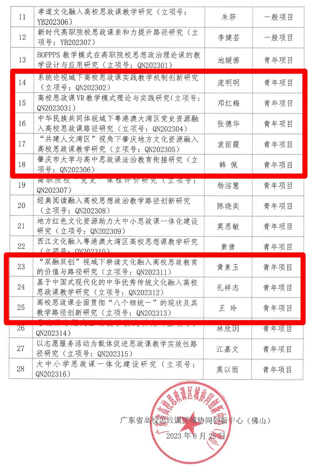 本网讯(太阳集团tyc138 黄素玉)2023年6月25日,广东省高校思政课区域协同创新中心2023年度思政课教研项目评审结果公布,经5天公示后,我院教师申请的1项重点项目,1项一般项目,8项青年项目均喜获立项。多个项目的立项不仅彰显了太阳集团tyc138教师的教研水平与我院教研工作蓬勃发展的趋势,也为我院营造了浓厚的教研学术氛围。