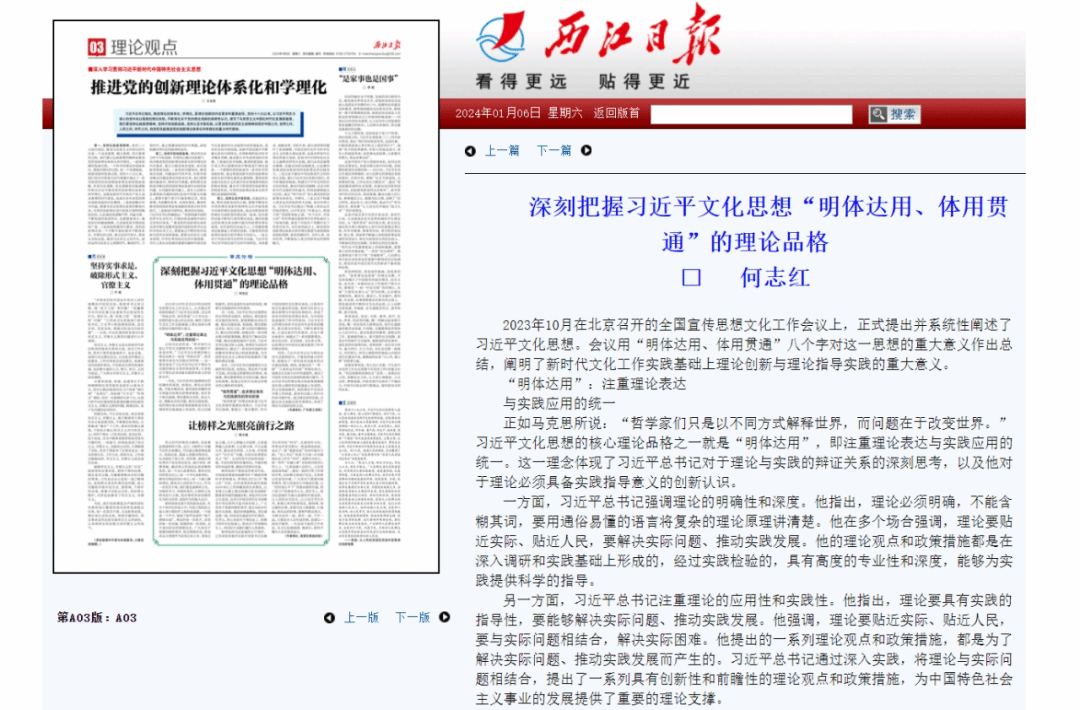 近日,我校太阳集团tyc138何志红教授关于习近平文化思想的研究阐释文章《深刻把握习近平文化思想“明体达用、体用贯通”的理论品格》刊登在1月6日西江日报理论版。