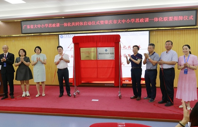 与会嘉宾为“广东省大中小学思政课一体化共同体牵头高校”暨“肇庆市大中小学思政课一体化联盟”揭牌。“广东省大中小学思政课一体化共同体项目单位”和“肇庆市大中小学思政课一体化联盟单位”代表也相继接受授牌。