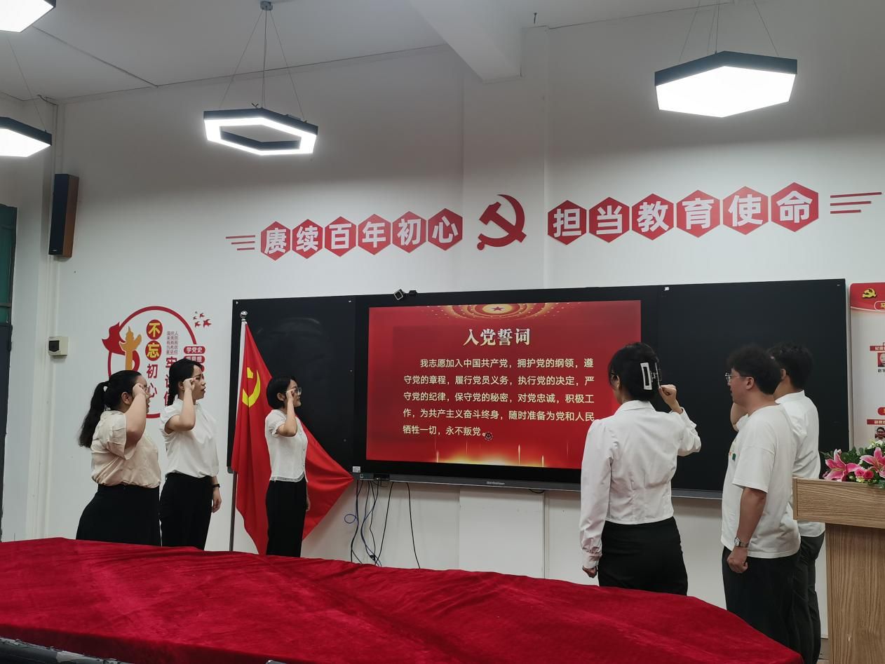 在饶静同志的引领下,五名预备党员身着正装,精神饱满地走上台前。他们庄严地举起右手,面对鲜红的党旗,高声宣读入党誓词,立下了为共产主义事业奋斗终身的誓言。这一刻,他们的眼中闪烁着坚定的光芒,誓言的每个字都透露出他们对党的忠诚和对共产主义事业的执着追求。