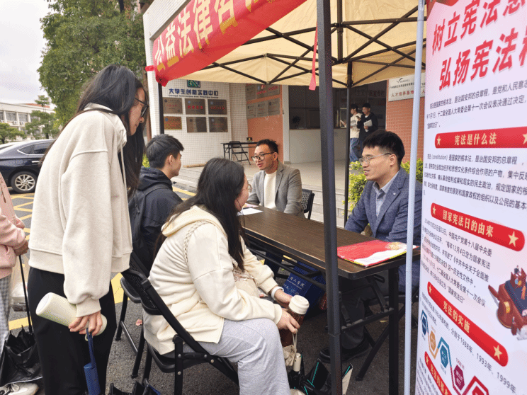 宣誓仪式结束后,现场展开了内容丰富、形式多样的宪法宣传与线下法律咨询活动。通过悬挂宣传横幅、设立普法展板、发放宪法读本与法治宣传资料等方式,向过往师生生动普及宪法知识,阐释宪法作为国家根本大法的核心要义与重要作用。设置的法律咨询台前人头攒动,具备法律专业背景的党员教师代表耐心细致地为前来咨询的同学们解答关于学业、生活、就业等方面遇到的法律疑问,提供了专业的法律指引,增强了大家的法律意识和运用法律武器维护自身合法权益的能力。