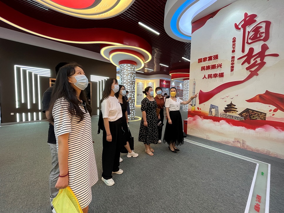 进入新时代文明实践中心主厅可以看到,宣传内容以“高举中国特色社会主义伟大旗帜,深入学习贯彻习近平新时代中国特色社会主义思想”为主线。以精神文明建设为主体内容,总共分为三大部分10个版块,内容涉及“学党史,明初心”“新时代,中国梦”“新时代,新成就”等,中心还设立了文字墙、小书吧、剪纸艺术等文化设施。党员教师们通过实地观摩、听取讲解等方式进行参观学习。