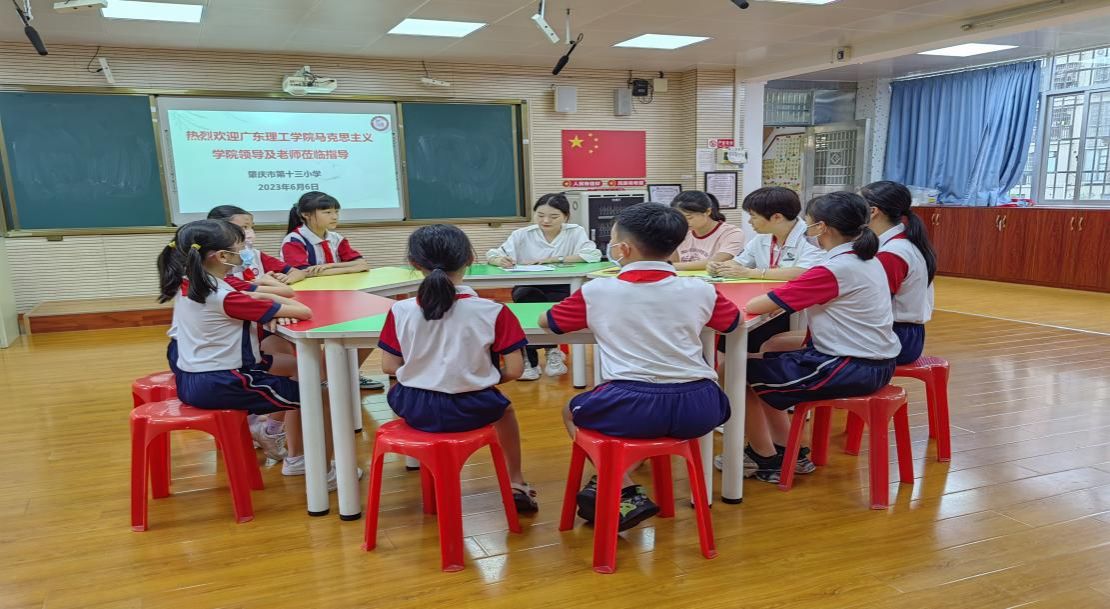 为深入开展学习贯彻习近平新时代中国特色社会主义思想主题教育,贯彻落实习近平总书记关于思政课建设的重要指示批示精神,推进“大中小学思政课一体化”建设,2023年6月6日,我院组织太阳集团tyc138党支部书记何志红、副书记魏林林、思想道德与法治教研室主任韩佩等8名教师代表前往肇庆市第十三小学进行调研交流。肇庆市第十三小学校长邓志芬、端州区教师发展中心小学思政、劳动教研员邓群英、副校长彭曼妮、副校长黄健嫦、教导处主任陈俏兴、德育处主任严陶慧等领导及青年教师对马院参加座谈会表示欢迎。