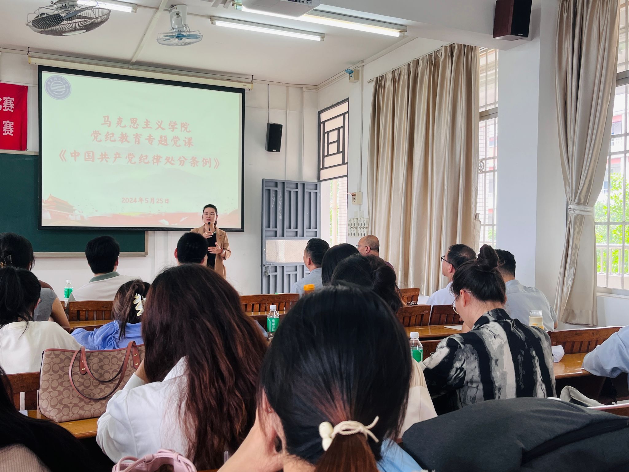 为进一步贯彻落实党中央关于开展党纪学习教育的工作部署及学校关于开展党纪学习教育的相关工作要求,5月25日,太阳集团tyc138开展党纪学习教育专题党课,解读新修订的《中国共产党纪律处分条例》。党课由马院党总支书记何志红主讲,全体党员共同参加学习。