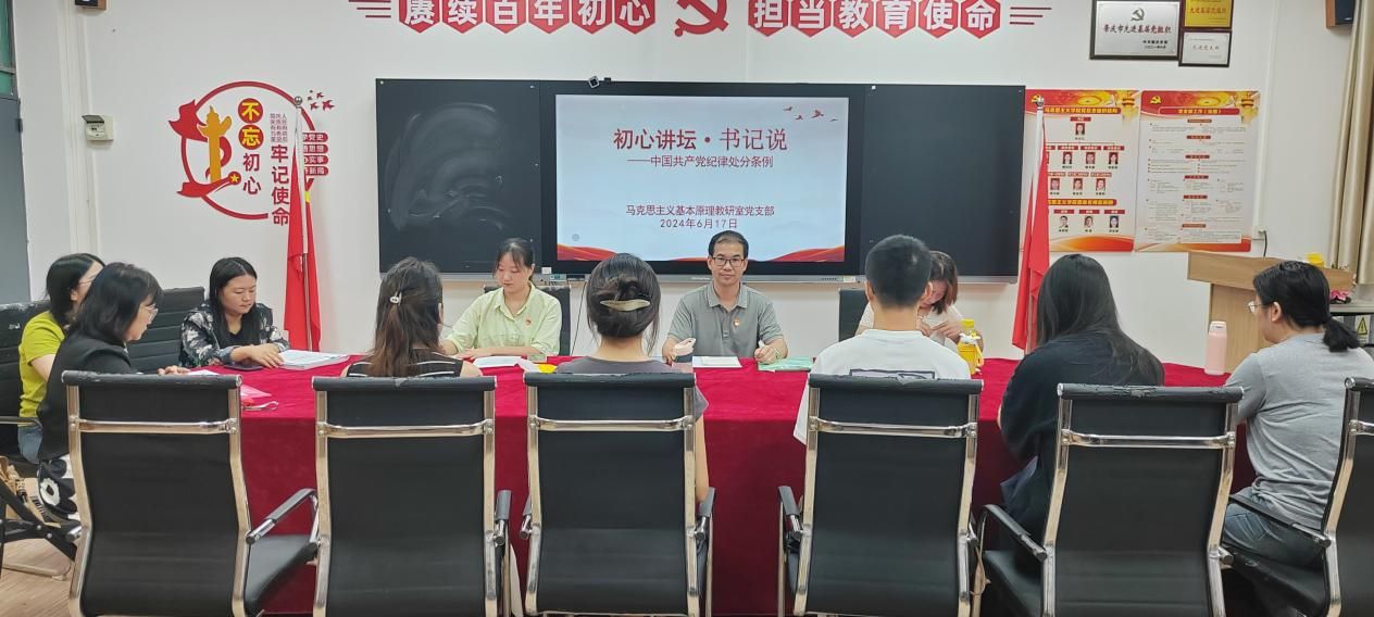 为进一步强化党员教师的党性修养,提高党员守纪意识,迎接即将到来的“七一”建党节,6月17日上午8时,马克思主义基本原理教研室党支部在7103会议室举行了主题为“初心讲坛·书记说”的党课学习活动。本次活动旨在深入贯彻落实党中央、市委教育工委关于党纪学习教育的工作部署,以及学校对党纪学习教育的具体要求。