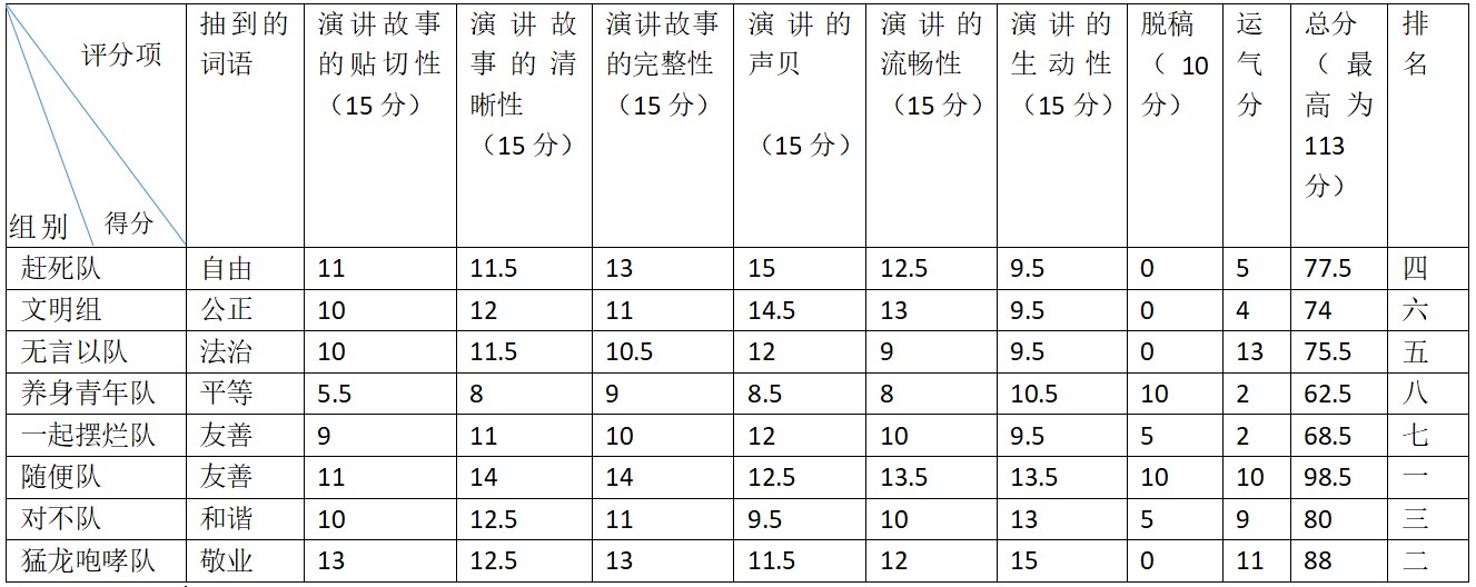 4. 评分环节:由兄弟班同学根据脱稿演讲故事的贴切性、清晰性和完整性、演讲的声贝大小、演讲的流畅性来综合打分。